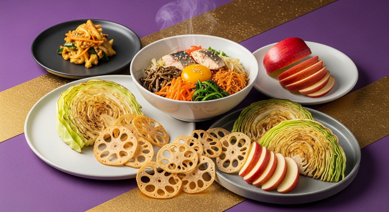 - 효능: 양배추의 설포라판과 풍부한 식이섬유는 혈당의 급격한 상승을 막아줍니다. 연근과 우엉의 뮤신 성분은 위벽 보호에 탁월하며, 탄수화물 흡수를 지연시켜 혈당 안정화에 도움을 줍니다.